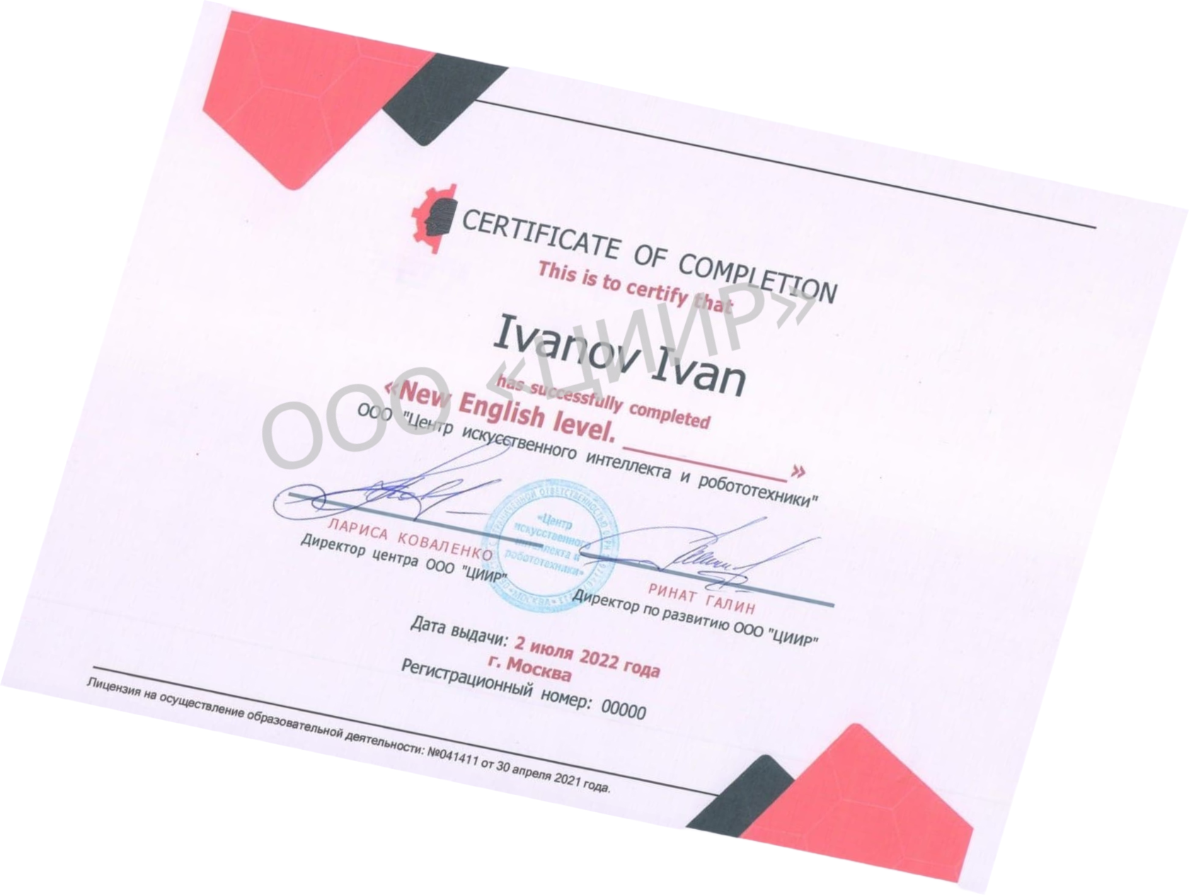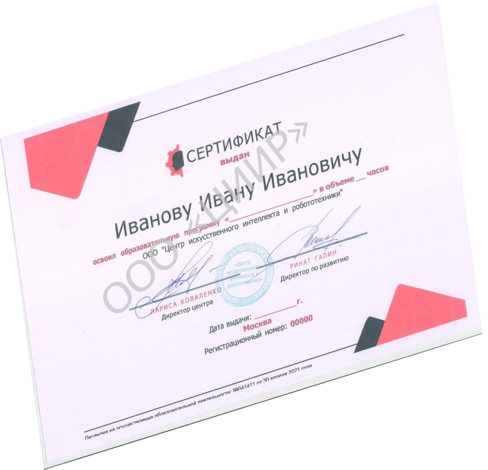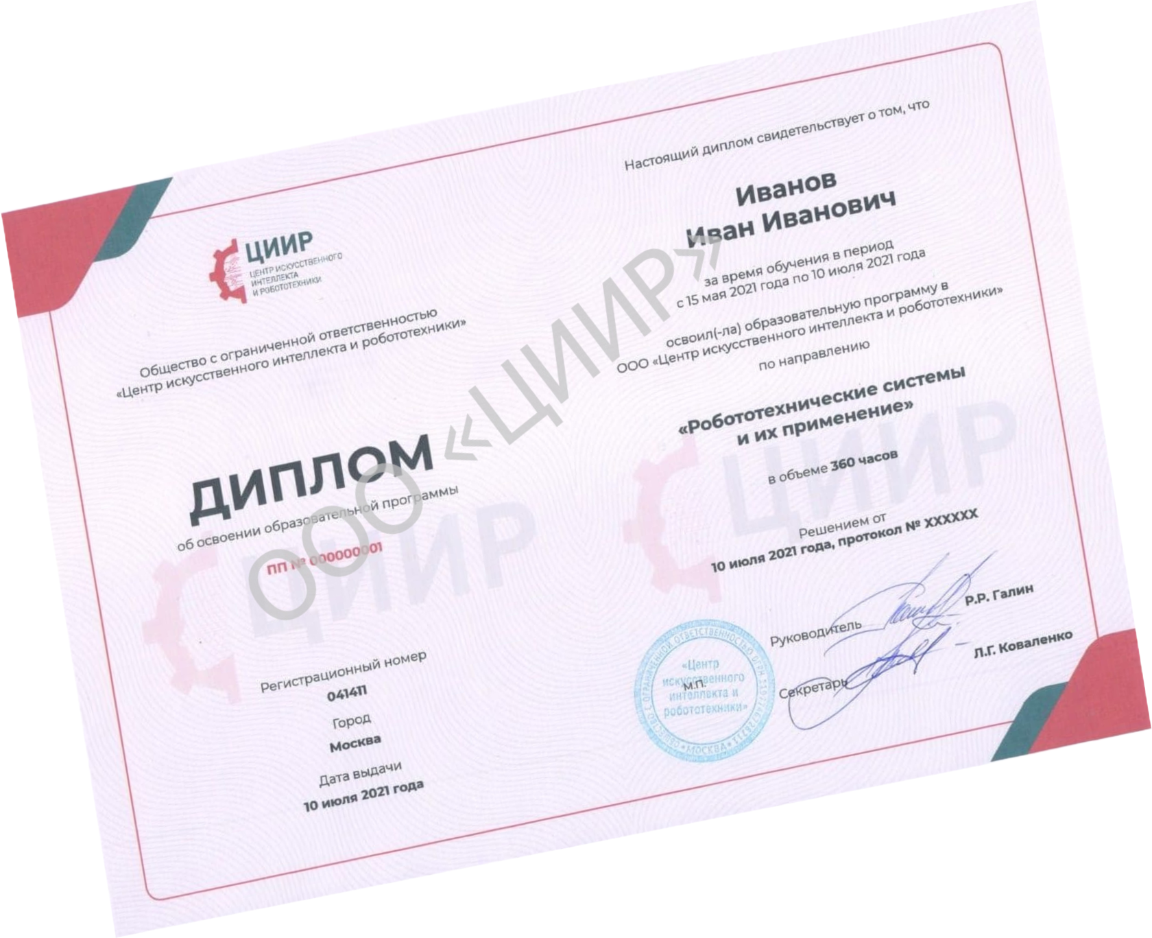 По окончании обучения студенты получают диплом нашего Центра Искусственного Интеллекта и Робототехники, который дает дополнительные баллы при поступлении в ВУЗ